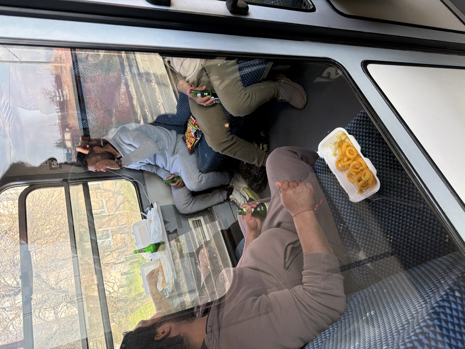 - "A view through a window into a passenger compartment reveals three adult males" by FM-fGWtR2, licensed under CC BY 4.0