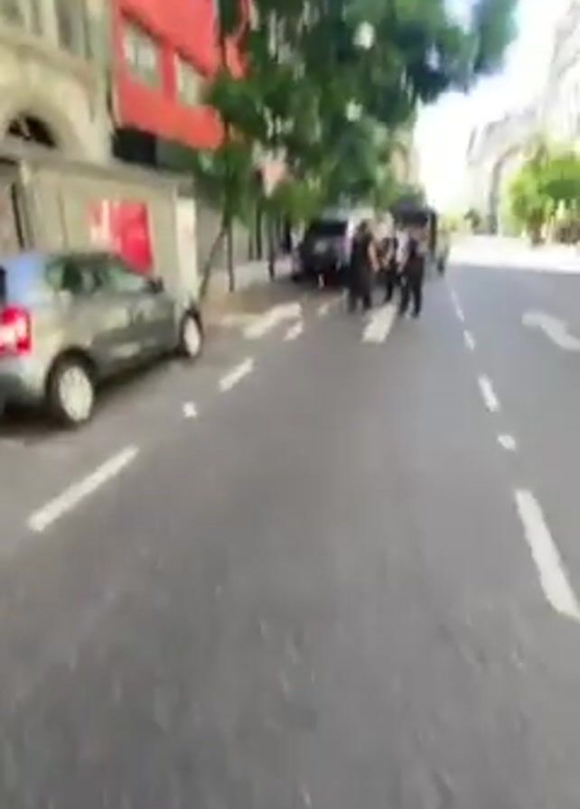 person walking down a street with white dividing lines and parked cars. The camera angle is low, showing the person's feet and lower legs wearing white pants and different colored sneakers. As the person walks, the camera pans up to reveal a street with trees, buildings, and parked cars. There are multiple people in dark clothing standing near a dark SUV with its rear door open. The people seem to be uniformed officers. The general environment appears to be an urban setting on a sunny day.