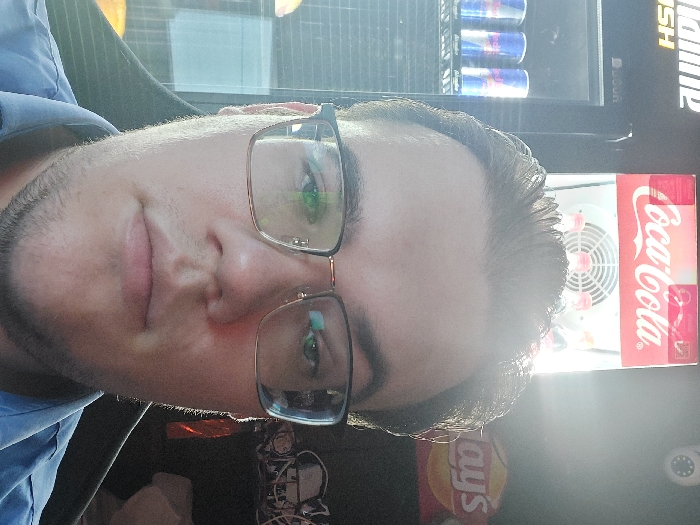A male individual is depicted in a frontal, head-and-shoulders close-up, reported to be in Tashkent, Uzbekistan. He has short, dark hair, light facial stubble, and wears dark-rimmed eyeglasses, looking directly at the camera with a neutral expression. He is dressed in a blue collared shirt. The background indicates an indoor commercial environment. To the viewer's left, a glass-front refrigerator displays multiple cans of Red Bull energy drink, with partial signage reading "laine" and "USH" above. Centered above the subject, a red Coca-Cola branded mini-fridge contains bottled beverages and an internal fan. To the viewer's right, a white dome-shaped CCTV camera is mounted, and below it, a Lay's brand potato chip bag is visible. Strong overhead lighting causes glare, notably reflecting in the subject's eyeglasses.