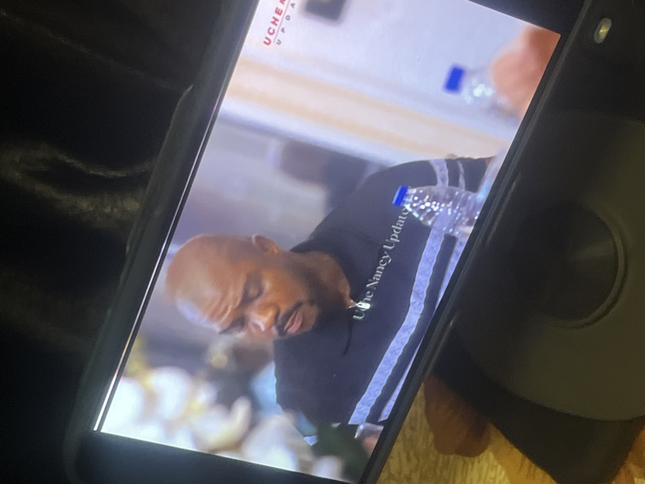 A smartphone displays a paused scene featuring a bald Black man in a black shirt with gray stripes. He appears to be looking down or sleeping. A water bottle with a blue cap is visible near his shoulder. Text, partially obscured, reads "Uche Nancy Update" on the screen. The phone itself is being held or propped up, with a blurred background of what appears to be furniture or bedding. The image is somewhat dark and grainy.