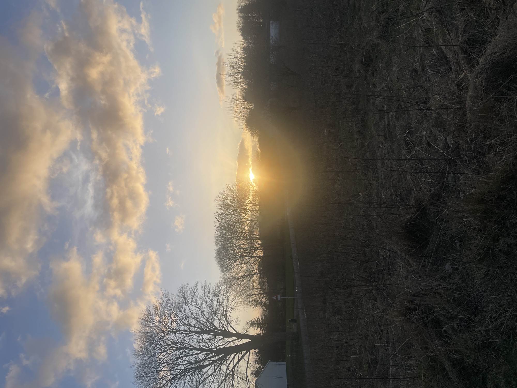 The image captures a sunset scene, likely in the outskirts of Vejle, Denmark. The sun is setting on the horizon, partially obscured by trees. The sky is a mix of blue and golden hues, with clouds reflecting the sunlight. Silhouetted trees line the horizon, and a field of dry grass is visible on the right side of the image. A road with a sign is present in the middle ground. A building is visible in the lower part of the image, with a leafless tree in the foreground.