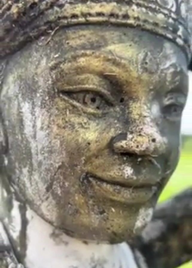 statue of a woman holding a basket on her head, in a rice field. The statue is weathered and covered in mold. The woman has a kind smile and a decorative headdress. The background consists of a lush green rice field under a blue sky with scattered clouds. The camera pans out to reveal the full statue and the surrounding landscape.