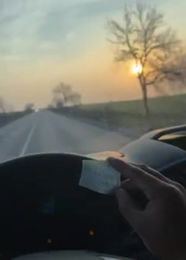 The video, shot from the driver's seat of a car, showcases a scenic drive during sunset