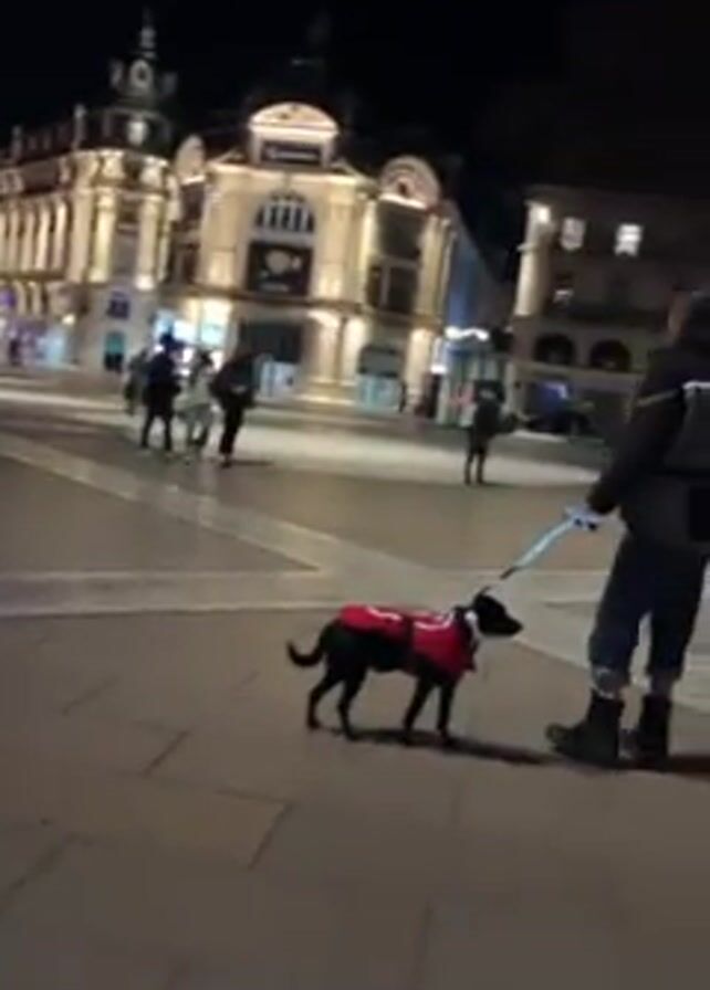 black dog wearing a red vest on a leash in a city square at night. The square is paved with light-colored stones, and several people are walking around. In the background is a large, ornately decorated building lit up with white lights. The person holding the leash is wearing dark pants and boots. The camera is moving slightly.