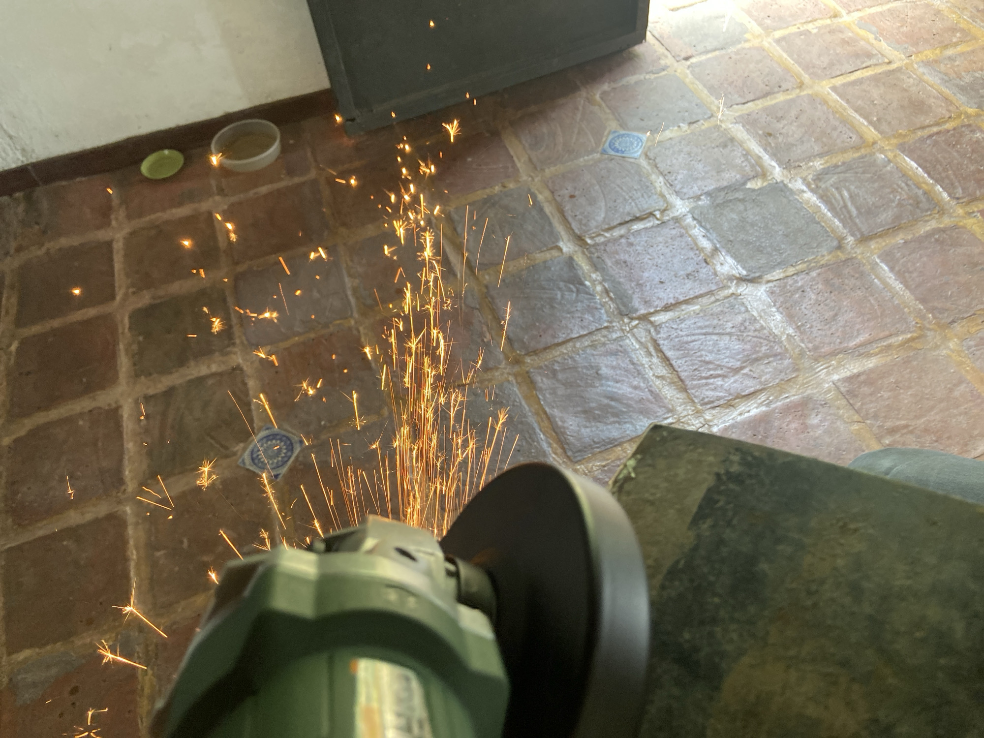A close-up image shows a power tool, likely an angle grinder, creating sparks on a tiled floor