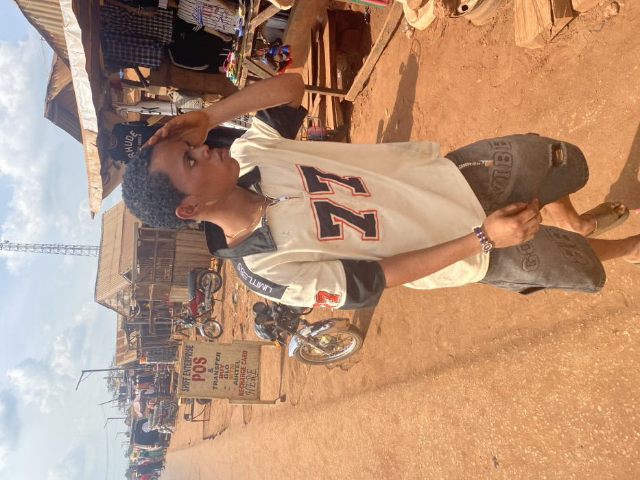 A young male stands on a reddish-brown dirt path in Ejule, Nigeria, his left hand raised to shield his eyes from the bright overhead sun