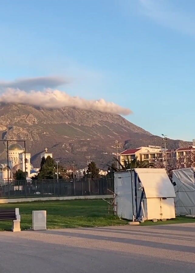The video captures a picturesque scene in what appears to be a coastal town, likely during the early morning or late afternoon, evidenced by the warm light. In the background, a majestic mountain is partially obscured by low-lying clouds. In the middle ground, there's a white-domed building, possibly a church, and some modern buildings. A green park area occupies the foreground, with a paved path running through it. There are a few benches and some small white tent-like structures in the park. Palm trees are scattered around, adding to the coastal atmosphere. People are walking along the path; one can see a woman in a pink dress and a man walking in the opposite direction. A fence encloses a sports area. The overall impression is serene and scenic.