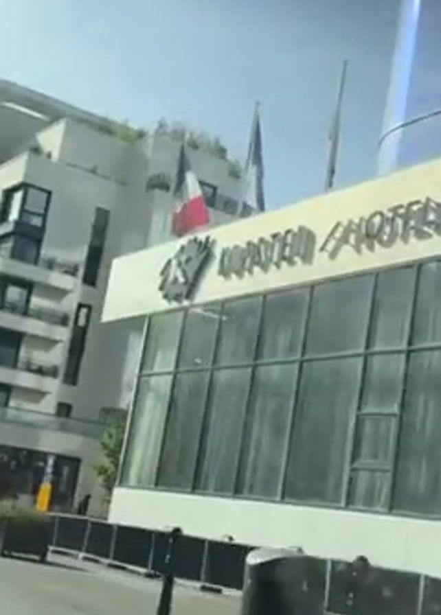 From inside a vehicle, a view of the exterior of the Kopster Hotel & Residence in Paris is visible. The building has white siding and a glass front. There are flags visible on the roof. A multi-story building can be seen next to the hotel.