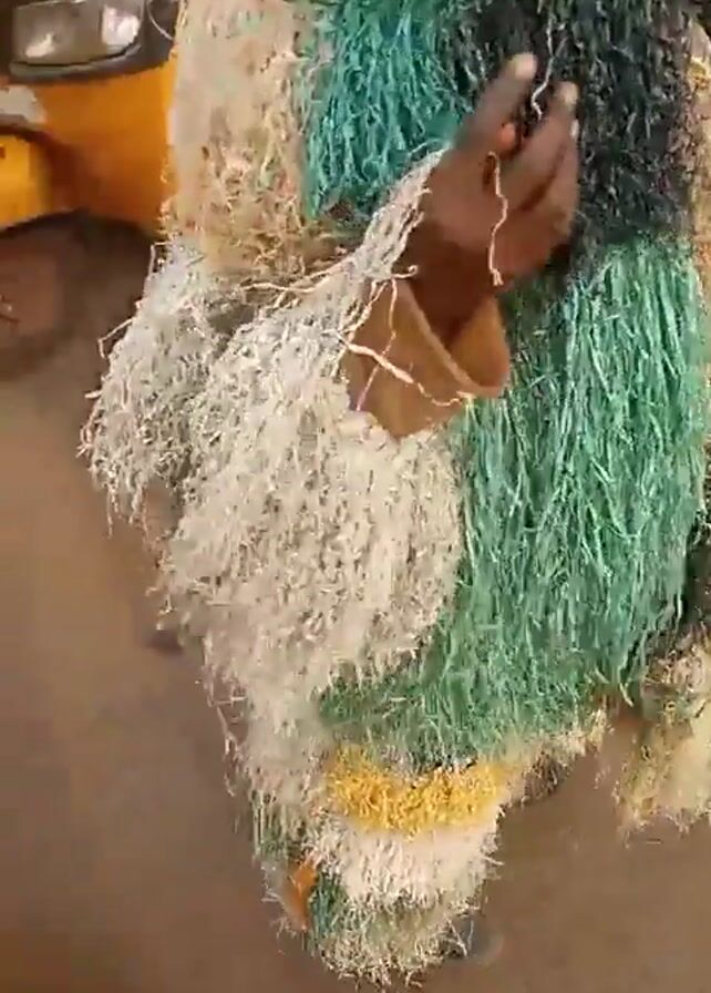 A person in a multi-colored, fringed costume stands on a street next to a yellow vehicle. The costume has layers of white, green, yellow, and black fringes. The person’s hand is visible holding the costume. A yellow three-wheeled vehicle is parked nearby. Another person in jeans stands to the right. The road surface is asphalt. A sandal and debris are visible on the ground. The camera moves slightly.