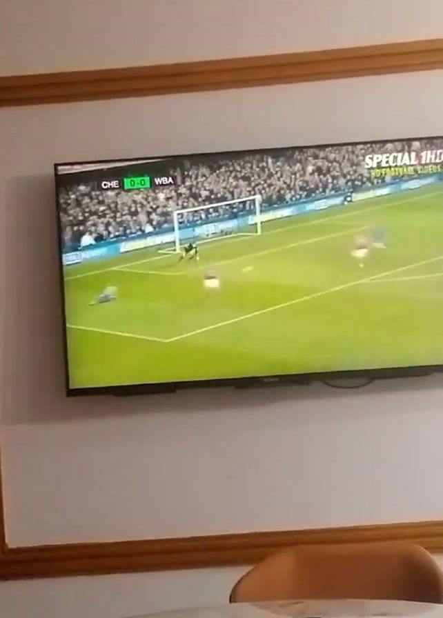 television screen displaying a football game. The score is CHE 1-0 WBA. A replay of the goal shows a player kicking the ball into the net, scoring a goal. The video then shows that Drogba scored the goal in the 26th minute. The television is mounted on a wall above a small round table. The wall is white with a brown border. A single chair is partially visible on the right of the frame.