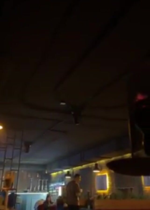 interior of a hookah lounge. The space is dimly lit with hanging lamps and string lights, creating a warm atmosphere. Red velvet booths line the walls, and people are seated, including one person with blonde hair facing away from the camera. A man in a t-shirt is standing and appears to be a server or staff member. There is a bar area in the background. Hookahs are visible on the tables, and neon signs decorate the brick walls. The camera slowly pans upward, showcasing the ceiling and the architectural details of the space.