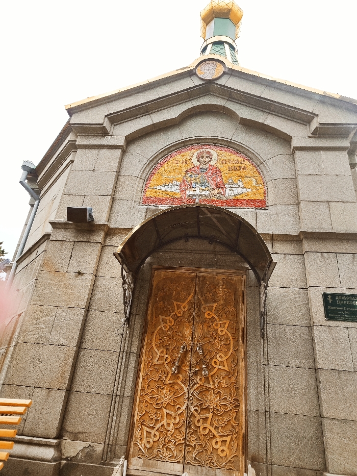 The image depicts a low-angle view of the entrance facade of a chapel or church, constructed from rough-hewn, grey-brown granite blocks, located in the city of Utios, Ukraine. The structure is surmounted by a golden dome with green accents and a small finial, beneath which is a circular medallion with an indistinct image. A prominent semicircular mosaic, composed of gold, red, orange, white, and blue tesserae, is centered above the entrance, portraying a haloed figure holding a cross and scroll, with stylized cityscapes in the background. A dark, curved metal awning with a golden underside extends over the main entrance. Below the awning are double wooden doors, richly carved with intricate, swirling floral and geometric patterns, and secured by a central padlock. Two ornate metal handles are visible on the doors. To the left of the entrance, a metal rain gutter and downspout are affixed to the stone wall, along with a dark rectangular object, possibly a light fixture. To the right of the entrance, a green plaque with white Cyrillic text is mounted on the stone facade. Several light-colored steps lead up to the doors. A section of a wooden bench with horizontal slats is visible in the lower-left foreground. The sky is uniformly bright and overcast. No individuals are present in the scene.