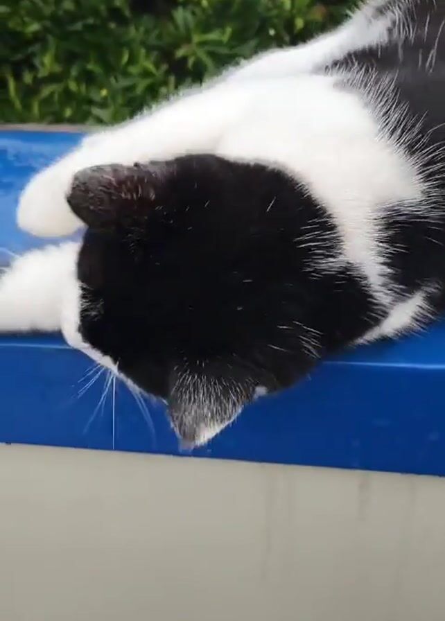 Here's a brief description of the video: The video shows a black and white cat lying on a blue surface
