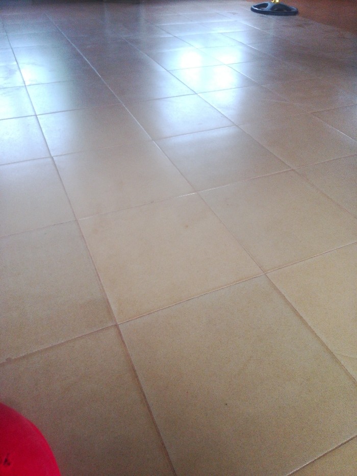 The scene depicts the interior of a room in Unknown, Unknown, focusing on a tiled floor. The floor is composed of light brown (beige) square ceramic tiles, each approximately 30x30 cm, separated by darker grout lines. The tile surface is semi-reflective, showing pronounced rectangular light reflections across the upper and middle portions of the frame, indicating an overhead light source. In the upper right corner, a dark, possibly black, circular object with a central vertical stem, consistent with the base of a floor fan or similar appliance, is partially visible. A curved, bright red object is partially visible in the extreme lower left corner. The background beyond the floor is dark and indistinct. No individuals or active subjects are present.