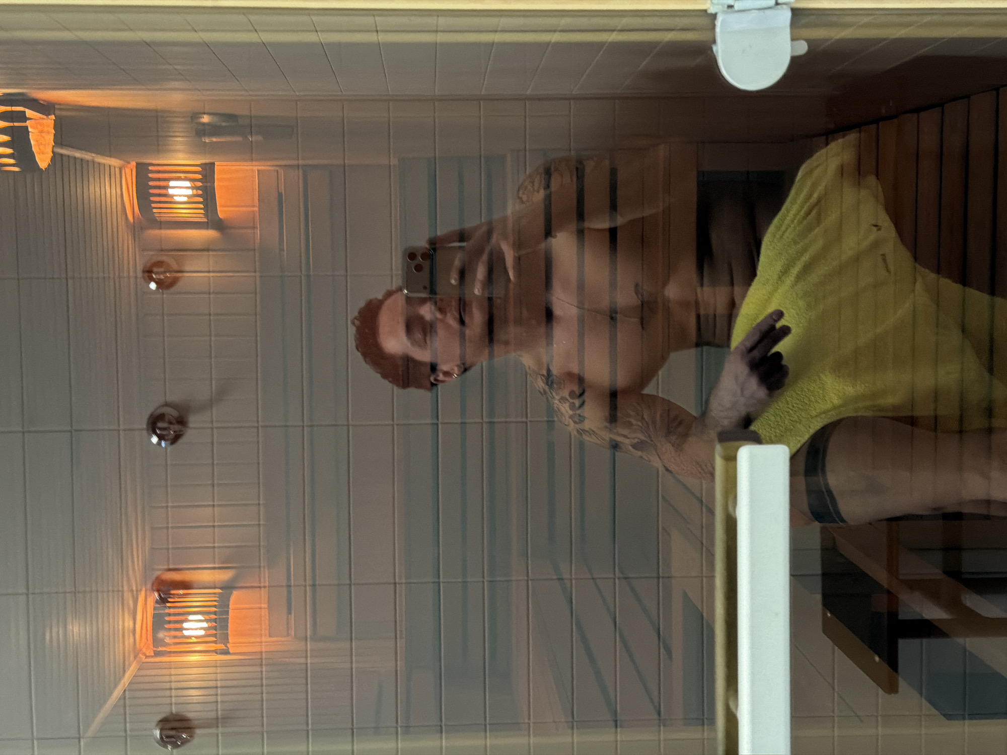 A male subject with reddish-brown hair and extensive arm/shoulder tattoos is seated within a sauna or steam room, capturing a selfie reflection with a smartphone