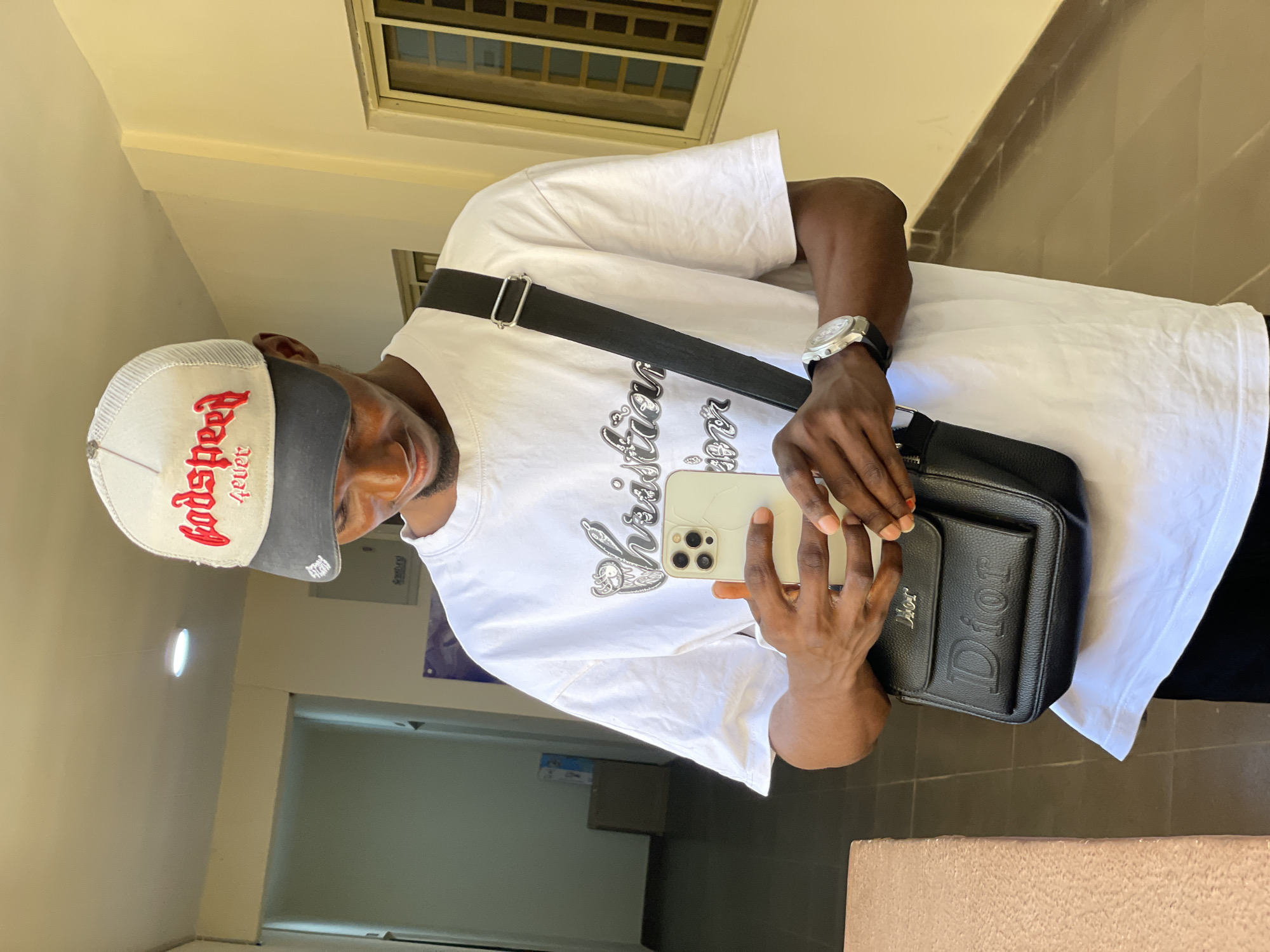 A young adult male, of dark complexion, stands within an indoor hallway environment in Lokoja, Nigeria. He is depicted looking downward at a light-colored smartphone held in both hands at chest level. The phone's rear camera array, consisting of three lenses, faces the viewer. The subject wears a white short-sleeved t-shirt featuring metallic "Christian Dior" text on the front. A black leather Dior crossbody bag is worn over his right shoulder, and a white and grey trucker cap, embroidered with "Godspeed forever" in red script, is on his head. A silver-toned wristwatch with a black strap is visible on his left wrist. The background consists of light beige walls, a white ceiling with a recessed light fixture, and a brown tiled floor. A doorway leading to a darker interior is visible on the left, and a window with a grid pattern is present on the right. A light-colored concrete ledge occupies the lower left foreground.