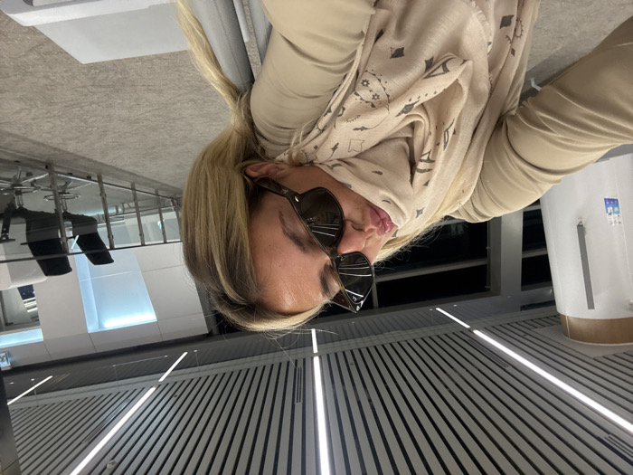 The scene is located within a modern interior space in the city of Nong Prue Subdistrict, Thailand. A blonde female subject occupies the foreground, positioned at an angle towards the camera. She wears large dark sunglasses, a light tan long-sleeved garment, and a light beige patterned scarf. Her lips are pursed, and her head rests tilted against a light grey public seating structure. The environment features a slatted ceiling with integrated linear lighting. To the left, a tall white cylindrical pillar with a metallic vertical accent and labels is visible. To the right, a glass and metal barrier separates the immediate foreground from an area containing multiple unoccupied black swivel chairs with chrome bases and white architectural elements with blue accent lighting. The flooring is a light grey material.