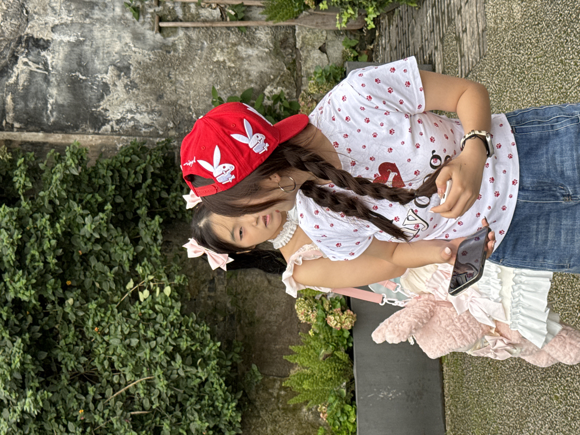 Two females are observed in an outdoor setting within Yuzhong District, China. The foreground subject, positioned with her back partially towards the viewer, wears a red baseball cap featuring three white Playboy bunny logos, a white t-shirt patterned with small red paw prints and a red heart graphic on the chest, and blue denim jeans. Her dark hair is styled in two braids, and she wears large gold-colored hoop earrings and a watch on her left wrist. She holds a dark smartphone in her left hand and a small white object in her right hand. The background subject, facing towards the foreground individual, has long dark hair adorned with a large light pink bow and wears a light-colored, frilly dress with a ruffled collar. She carries a large pink stuffed animal, possibly a rabbit or bear, with a pink strap, appearing to function as a bag. The environment features a wall partially covered in dense green foliage, a weathered grey concrete wall with visible discoloration and two wooden paddle-like objects leaning against it, and a planter containing green plants and light-colored flowers. The ground surface is textured and grey.