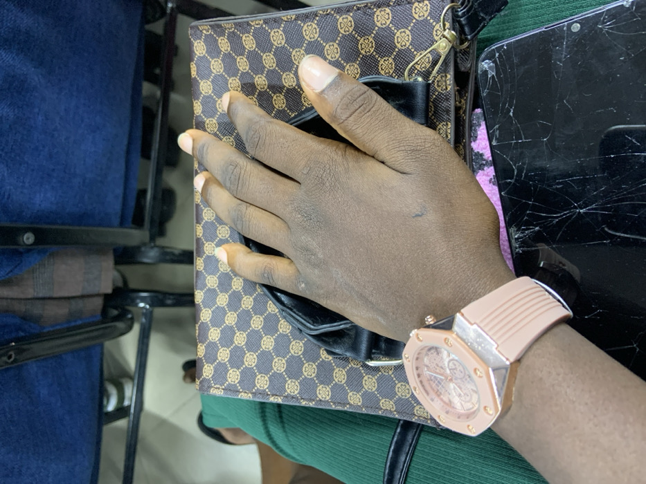 The image, captured in Idimu, Nigeria, presents a close-up, downward view of a person's left arm and hand. The hand, exhibiting dark skin and short, light-colored fingernails, rests on a dark brown handbag adorned with a repeating gold geometric pattern. A rose gold-toned wristwatch with a light brown ribbed strap is worn on the wrist. Partially visible beneath the bag and wrist is a black smartphone or tablet with an extensively cracked screen. The individual's lap is covered by green ribbed fabric. In the background, blue fabric-covered public seating with black metal frames is visible, with glimpses of other occupants' legs and feet, one wearing white sneakers and another dark sandals, on a light-colored tiled floor.