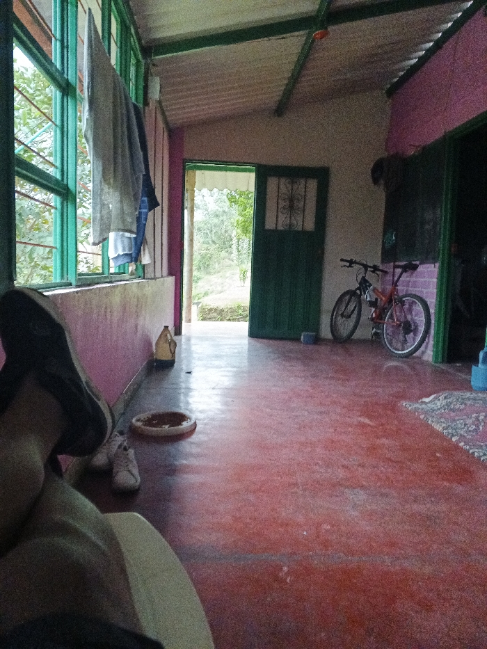 A room with a red floor has a bike against the right wall. An open green door shows a view of trees outside. A window with clothes hanging on it sits to the left. A pink wall is on the left, while a light tan wall is on the right. A dog dish and shoes sit on the floor near a large plastic container. The legs and foot of a person are in the foreground.