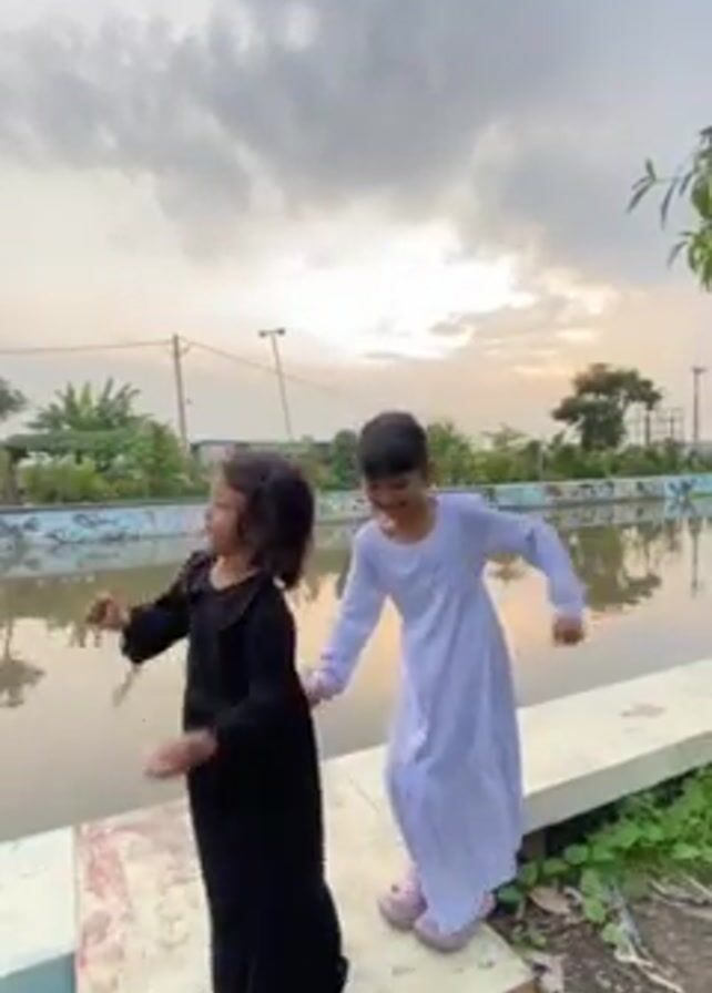 Two young girls, one in a long black dress and the other in a long white dress, are playing near a pond or water feature under a cloudy sky. The girl in white is visibly excited and jumps around, while the girl in black makes arm gestures. They are standing on a concrete ledge beside the water, with greenery nearby. The background includes trees and other structures, suggesting a park or outdoor recreational area. The overall setting is somewhat dim due to the overcast sky.