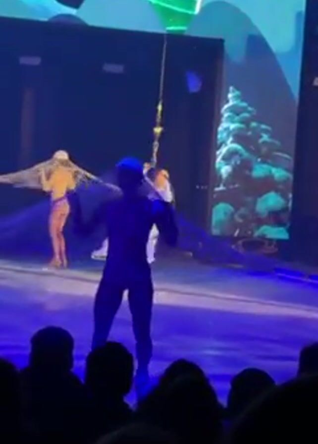 n ice skating performance in a darkened auditorium with an audience of mostly silhouetted figures in the foreground