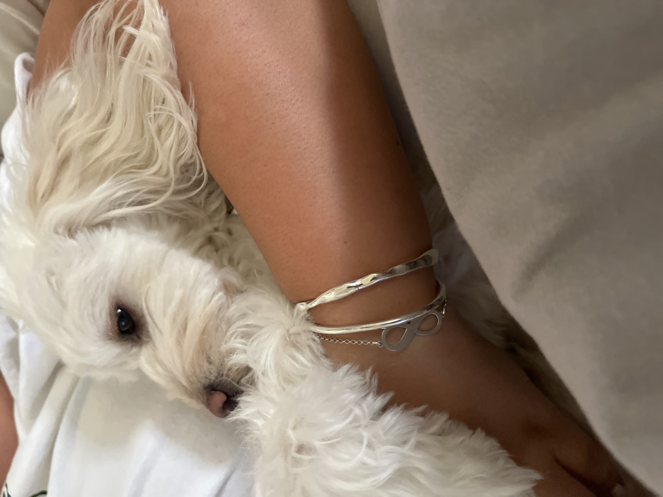 The scene, located in Ramat HaSharon, Israel, depicts a close-up of a small, white dog resting intimately against a human arm, likely indoors. The dog, with white, wavy fur, a pink nose, and dark eyes, is positioned with its head turned left, appearing to be asleep or deeply relaxed. A tanned human forearm extends from the right, providing support for the dog's head and upper body. Two silver-toned bracelets adorn the human wrist: one is a wide, cuff-style bracelet with a hammered or irregular texture, and the other is a thinner chain bracelet featuring an open-worked infinity symbol charm. The background consists of soft, light-colored fabrics, specifically white material directly beneath the dog and arm, and a light grey or tan fabric in the bottom right corner, suggesting a bed or couch setting.