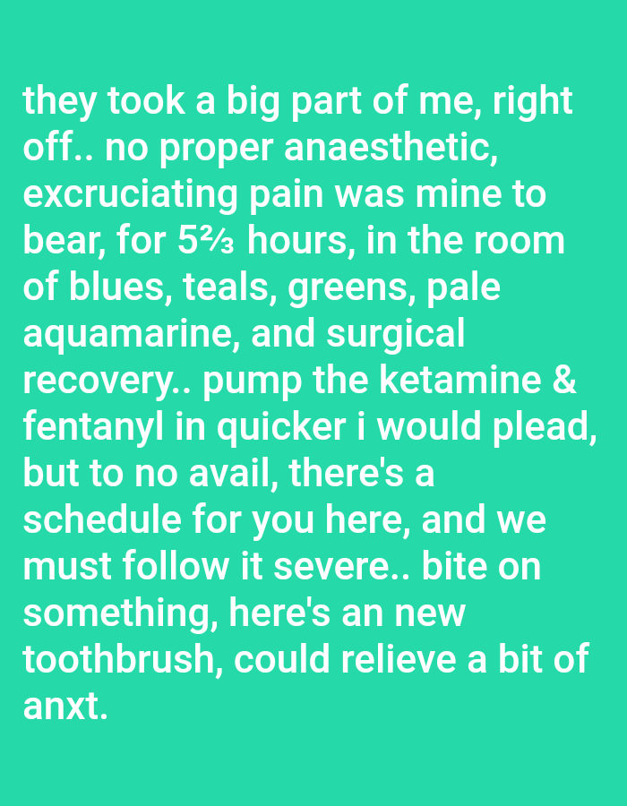 block of text on a turquoise background. The text is a personal reflection about a painful medical experience. It describes the excruciating pain experienced by the individual and the sense of helplessness and frustration in their situation. There are no people, actions, or objects depicted in the image, other than the text. The text is written in a conversational, personal tone. The coordinates provided (latitude: 48.442, longitude: -123.369) correspond to a location in the city of Victoria, Canada, but the image itself does not depict anything related to the location. The location provided is irrelevant to the image's content.