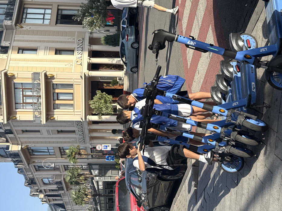 The image captures an urban street scene in Batumi, Georgia, specifically near a prominent building displaying "CASINO" and the Georgian script "სამორინე" (Casino) above its entrance. This multi-story structure, alongside others, features classical architectural elements, including columns and balconies, with a light-colored facade. Palm trees and other foliage line the street. In the foreground, a row of at least six light blue and black "JET" brand electric scooters is parked on a paved sidewalk. Four young males are positioned around these scooters. One boy on the far left, wearing a white t-shirt, dark shorts, and a black backpack, is leaning towards the handlebars of a scooter. Three other boys, dressed in matching blue and white athletic tops and shorts, stand nearby, one carrying a blue sports bag. The street features parked vehicles, including a dark sedan directly behind the group of boys and a light grey hatchback further down the road. A red and white striped pedestrian crossing is visible, with a person's lower legs and white-shoed feet partially seen walking on it. Street furniture such as a lamppost, a "P" parking sign, and a "40" speed limit sign are also present. The scene is illuminated by bright daylight.