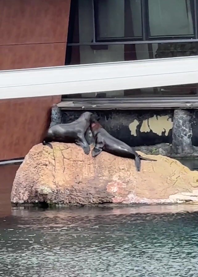 two dark-colored seals on a large rock in a body of water. The rock is close to a building with windows and a brown exterior. One seal is lying down, while the other is sitting up. They appear to be interacting, possibly nudging each other. The water is slightly rippled.