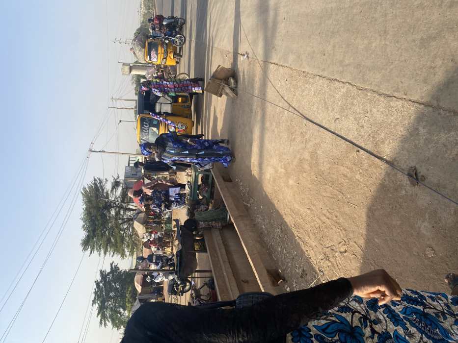 The image displays an active roadside market scene in Nassarawa, Nigeria, under a clear, bright sky