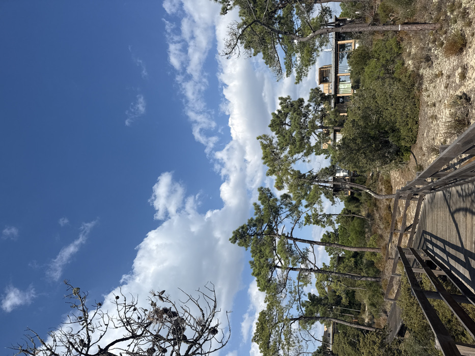 The image depicts a sunlit natural and developed landscape in Grândola, Portugal. In the foreground, a weathered wooden boardwalk with parallel railings extends into the scene, curving slightly to the right. Distinct shadows are cast onto the boardwalk, indicating strong overhead sunlight. The midground is characterized by a dense growth of tall, slender pine trees with full green canopies, interspersed with lower-lying scrub brush and areas of sandy, light-brown ground. A prominent dead tree branch adorned with pinecones is visible in the upper left corner. In the background, partially obscured by the tree line, are several modern residential buildings featuring flat roofs, light-colored facades, and extensive glass windows. The sky above is clear blue with scattered white cumulus clouds. No individuals or active subjects are visible in the scene.