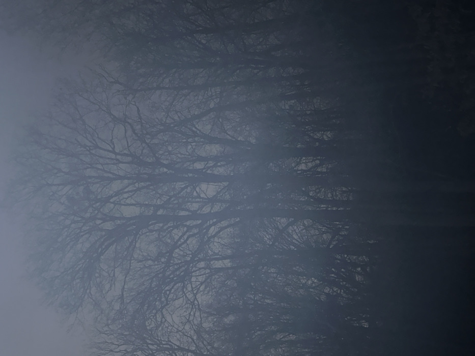 A dense thicket of bare tree branches fills the frame. Overlapping limbs create a dark, maze-like pattern. The trees are shrouded in thick fog, obscuring their details and softening the overall scene. Wisps of light filter through the fog, adding depth. The color palette is muted, dominated by shades of gray and blue. The image evokes a sense of mystery and isolation.