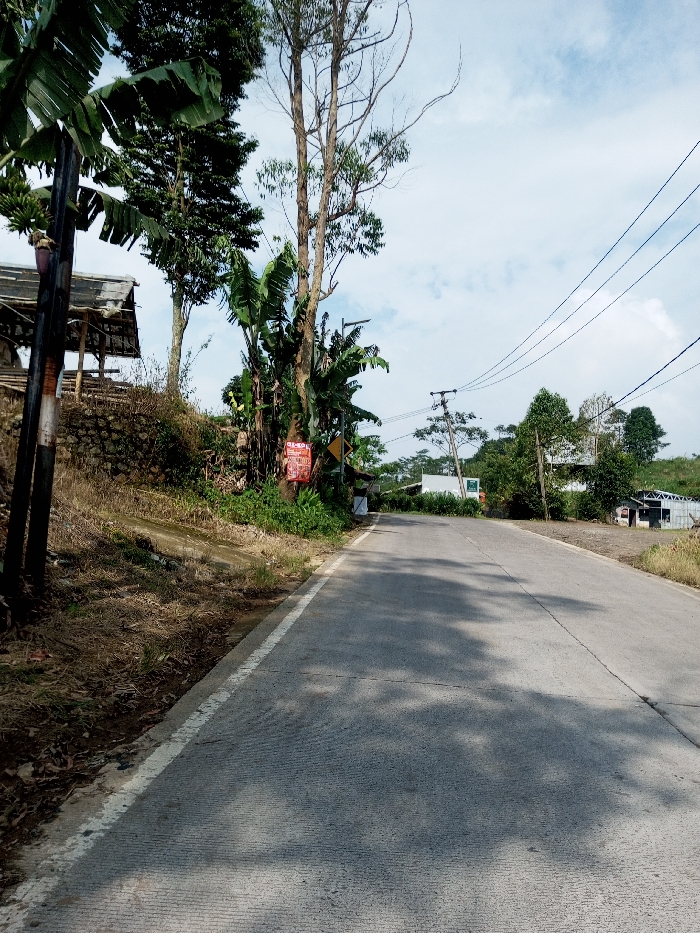 The scene depicts a rural road in Sandamal Eliya, Sri Lanka, viewed from a slightly elevated position looking forward along its length. The concrete road, grey and textured with visible expansion joints and minor cracks, features a worn white solid line marking its left shoulder. Distinct shadows from overhead trees are cast across the road surface. To the immediate left, a dark utility pole is partially visible. Adjacent to it, a steep, overgrown embankment composed of earth, rocks, and dry vegetation rises, with a narrow drainage channel running along its base. Above this embankment, a rustic, open-sided structure with a corrugated roof is partially visible, appearing to be elevated. Various trees, including prominent banana plants with large green leaves and a tall, slender tree with mostly bare branches, line the left side of the road. A rectangular red and white sign or banner is affixed to a tree or pole on the left, adjacent to the road. Multiple utility poles supporting several strands of overhead power lines extend along both sides of the road into the midground. In the mid-distance, on the right side of the road, a simple, low-lying structure with a light-colored roof is visible. Further into the background, the landscape consists of dense green foliage and trees, with a few white and light-colored buildings intermittently visible through the vegetation. The sky above is clear blue with scattered white cumulus clouds. No individuals or vehicles are present within the frame.
