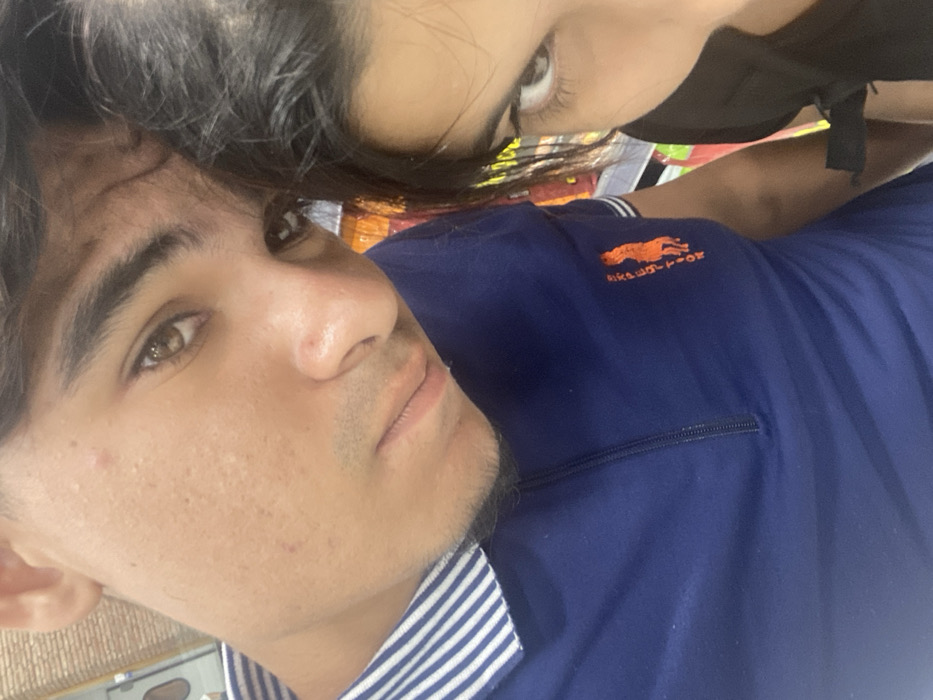 A selfie-style image presents two individuals. Dominating the foreground is a light-skinned man with brown eyes and dark hair. He's wearing a blue collared shirt with a striped collar. Above him, partially out of focus, is a dark-haired woman with dark eyes. She wears a black mask. The camera angle is tilted, providing a close-up perspective of their faces.