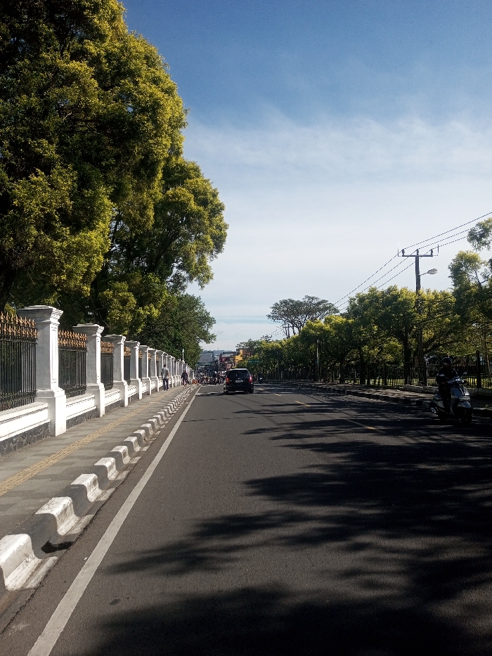 The image displays a daytime street scene in Phonethan, Laos, under a clear blue sky with sparse clouds. A dark asphalt road, partially covered by shadows from trees, dominates the foreground and extends into the distance. A solid white line marks the immediate left edge of the vehicular lane. On the left side, a grey paved sidewalk is separated from the road by a segmented white and grey concrete curb. Parallel to the sidewalk is a decorative fence, characterized by regularly spaced white square pillars topped with ornate caps, connected by black metal railings featuring gold-colored scrollwork. Behind this fence, large, dense green-leafed trees form a continuous canopy. Several indistinct human figures are visible walking on the sidewalk in the mid-ground. On the road itself, a dark-colored minivan or SUV is observed traveling away from the viewer in the mid-distance. To the right of the road, a line of green trees runs parallel, casting significant shadows onto the asphalt. Above these trees, a dark utility pole with multiple overhead wires is visible. On the far right shoulder of the road, a silver-grey scooter is parked, with a person wearing a dark jacket and helmet seated on it.
