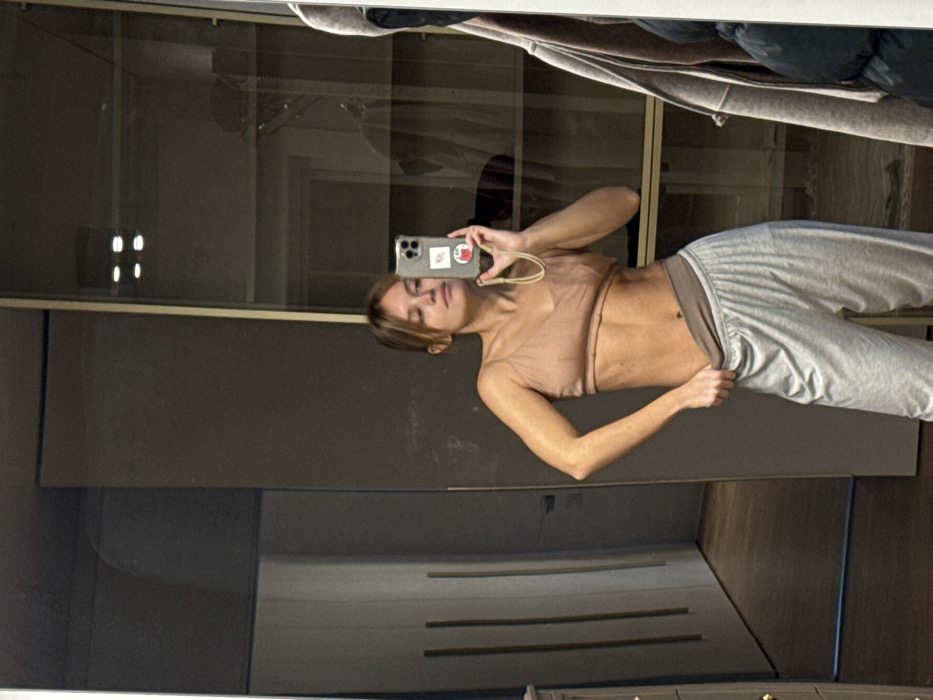 A young adult female is depicted in a mirror selfie taken indoors within a residential setting in Hrodna, Belarus. She stands facing the mirror, holding a smartphone with a light-colored lanyard and decorated case in her raised right hand. Her left hand pulls down the waistband of her light grey sweatpants, partially exposing a darker undergarment band and her lower abdomen. She wears a light brown, thin-strapped bralette. Her hair is light brown and styled with a middle part. The background features a dark-paneled door or wardrobe with vertical accents and gold-colored handles on the left. To the right, a glass-fronted cabinet reflects two square ceiling lights and internal hanging garments. The flooring is dark wood.