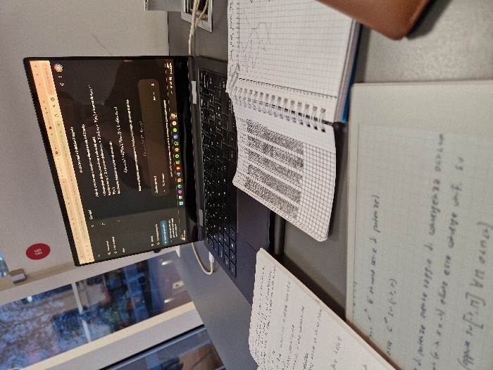 An open laptop displays a website. A notebook with graph paper sits to the right of the laptop, with some of its pages flipped over. Next to it is a notepad containing handwritten notes. A charger cable stretches between the laptop and a wall outlet. A window is visible in the lower-left corner, partially reflecting the room's interior.