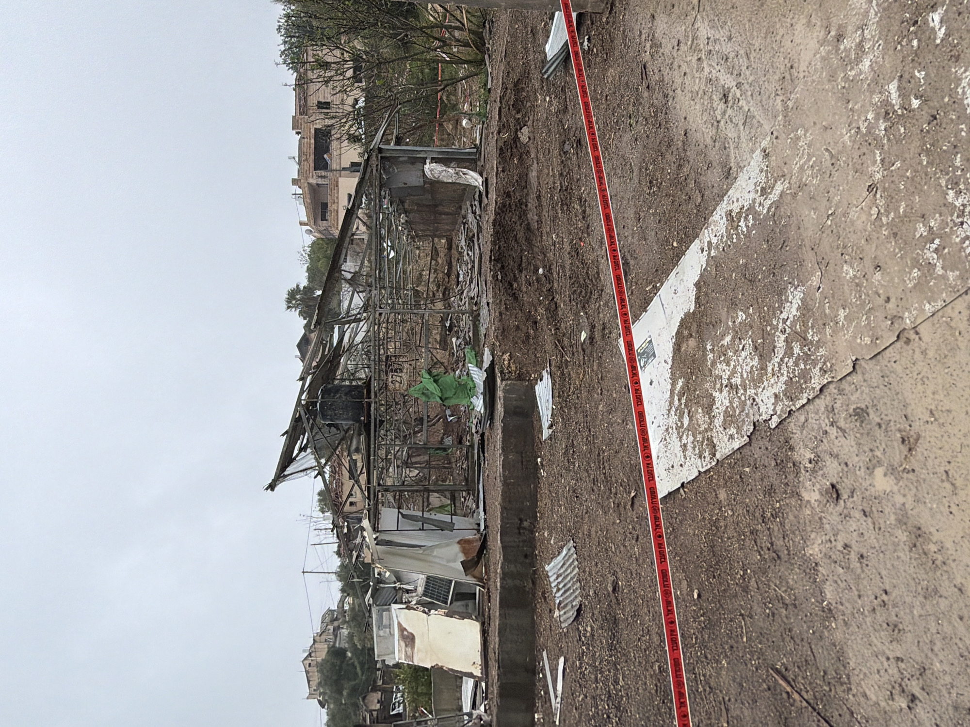 destroyed building in the Mate Yehuda Regional Council, Israel. The building appears to be a metal-framed structure, possibly a greenhouse or similar agricultural building. It has sustained significant damage, with the frame twisted and debris scattered around. A white object rests on the top structure of the destroyed building. A red tape marks the area in front of the destroyed building. The ground is dirt and gravel. In the background, other buildings can be seen. The sky is overcast.