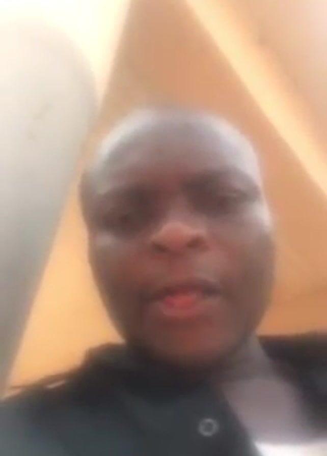 The video is a close-up shot of a Black man with a shaved head, wearing a dark shirt with a white undershirt, speaking directly into the camera. The background is blurry, showing a light-colored ceiling with a triangular design. He appears to be outdoors or in a covered area with some natural light.