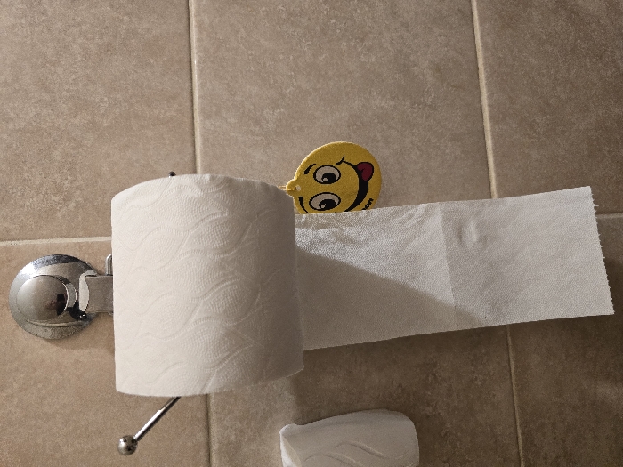The scene is located in a bathroom in Pleven, Bulgaria. A chrome-plated, wall-mounted toilet paper holder with a circular suction cup base is affixed to light brown rectangular ceramic wall tiles. A white roll of toilet paper, featuring a wavy embossed pattern, is mounted on the holder, with an unrolled section descending vertically. A yellow, circular air freshener or novelty item, depicting a grinning emoji face with a protruding red tongue, hangs from the lower edge of the unrolled toilet paper section. A white, ribbed plastic wall-mounted dispenser is partially visible on the far left of the frame.