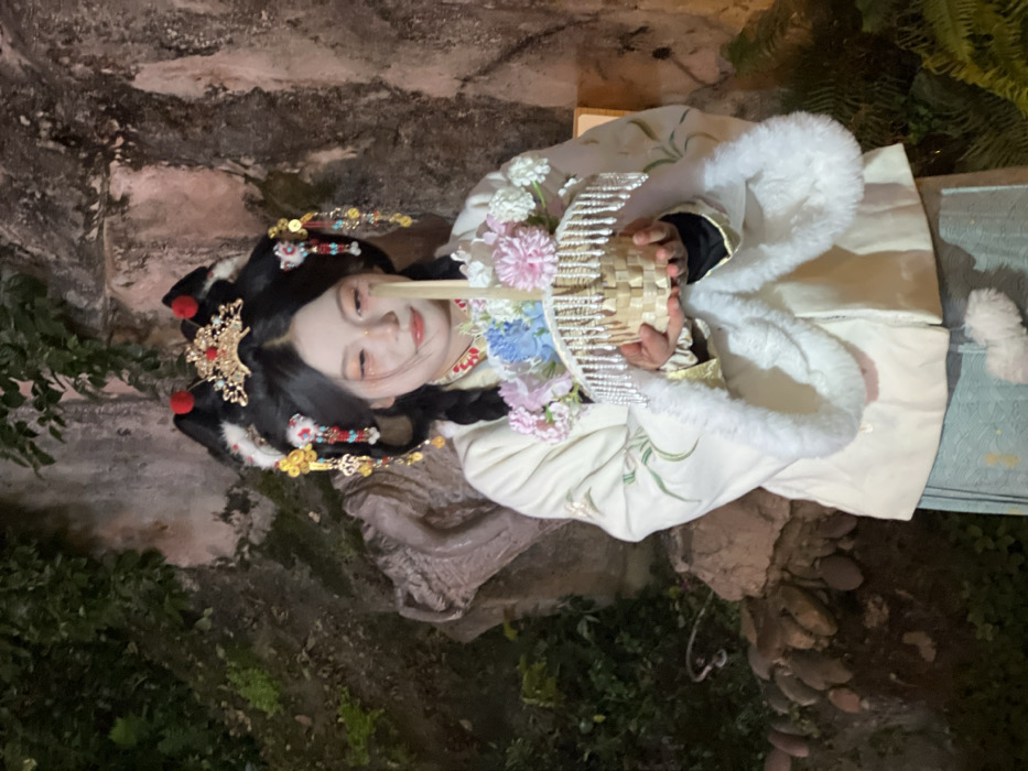 An individual is depicted in a vertical, medium-shot photograph taken in what appears to be an artificially lit outdoor or semi-enclosed environment, likely within a themed setting in Yuzhong District, China. The subject is a person of apparent East Asian ethnicity, positioned centrally, facing slightly towards the viewer's right with a soft, closed-mouth smile and eyes cast downwards. The individual is dressed in traditional attire. The primary garment is a cream-colored jacket or coat with wide sleeves, featuring a fluffy white fur trim along the cuffs and collar. Subtle green embroidered floral patterns are visible on the sleeves and front of the jacket. A darker garment, possibly black, is worn beneath the jacket. The lower body is partially visible, showing a light blue or greenish skirt with a subtle woven pattern. The person's dark hair is styled elaborately with two large, rounded sections on either side of the head, adorned with a central golden crown-like ornament featuring red accents and a prominent red pom-pom on each side. Dangling golden hairpins with various beads, including red and blue, extend from the side hair sections. Two thin braids frame the face. The facial makeup includes light-colored glitter or pigment around the eyes and pink-toned lips. Both hands are holding a small, light-colored woven basket, likely made of bamboo or wicker, at approximately chest height. The basket contains an assortment of artificial flowers in shades of light pink, light blue, and white. A thin, light-colored vertical handle extends upwards from the basket. The rim of the basket is embellished with a fringe of small, white, bead-like ornaments. The background consists of a dark, rugged rock wall or formation covered in sparse green foliage, primarily on the left side. A darker, more abstract rock feature is discernible behind the subject's left shoulder. The lighting in the scene is localized, illuminating the subject while the background remains relatively dim, suggesting an evening or controlled lighting setup. The environment's features are consistent with a landscaped garden or cultural attraction found in an urban district.
