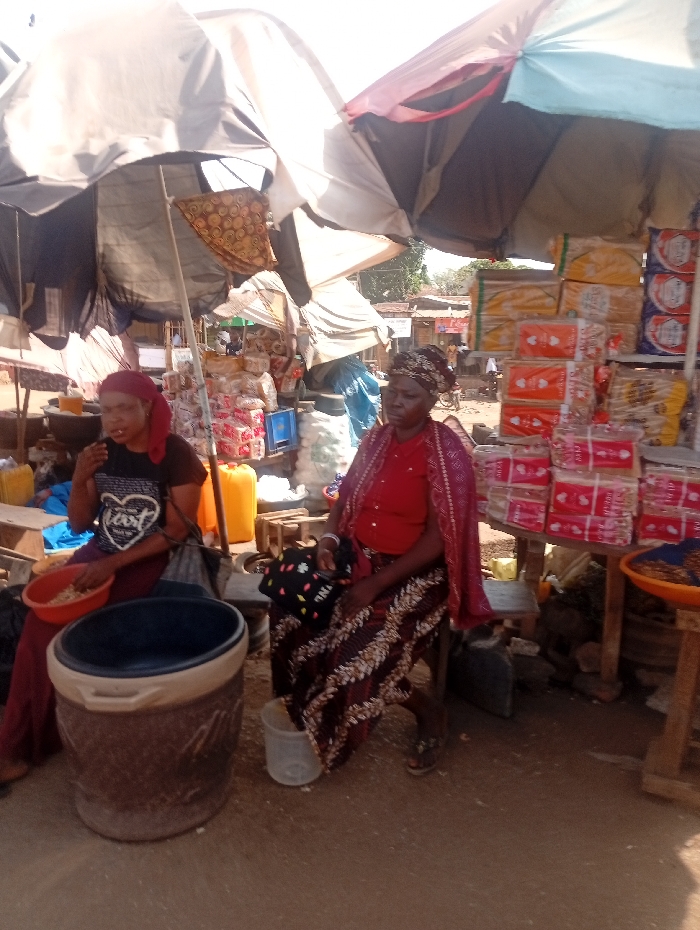 The image captures an outdoor market scene in Itobe, Nigeria. Two women are seated under multiple overlapping tarpaulin canopies that provide shade over a dirt ground surface. On the left, a woman wearing a dark t-shirt with a white design, a red headscarf, and dark trousers is seated, holding an orange bowl containing light-colored items, possibly food, and appears to be eating or sorting them. A black bag is positioned beside her. In the immediate foreground, a large, cylindrical, brown container with a dark rim stands. On the right, a second woman is seated, dressed in a red top, a patterned long skirt, a matching headwrap, and a patterned shawl draped over her shoulders. She looks towards the left. A small white plastic cup is on the ground near her feet. Behind both women, numerous packaged goods are displayed on wooden tables, indicating a market stall. These items include stacks of products in yellow, orange, and red packaging. On the left background, yellow plastic jerrycans and a blue plastic crate are visible. On the far right, another wooden table holds an orange bowl containing small dark items.