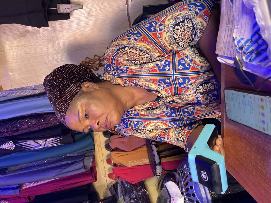 A middle-aged woman with dark skin, wearing a multi-patterned long-sleeve blouse with blue, red, and gold motifs, and a dark, embellished headwrap, is seated at a wooden counter within a retail clothing establishment in Samaru, Nigeria