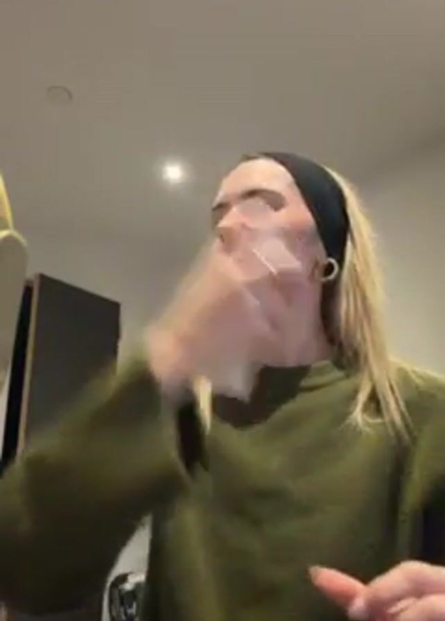 A blonde woman wearing a green sweater, gold hoop earrings and a black headband sprays her face with a clear liquid from a white spray bottle, then holds up an orange bottle in her hand. The room has a door in the background and a round ceiling light.
