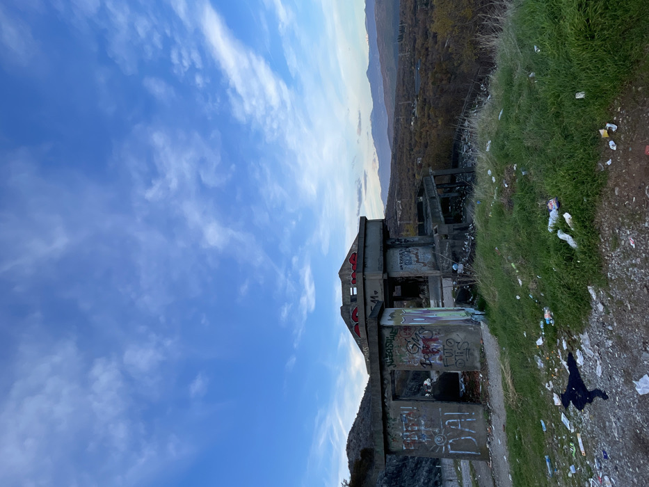 - "The image depicts an abandoned and heavily vandalized concrete structure situated on a dirt and grass hillside, overlooking a forested valley and distant mountains, under a partly cloudy blue sky in Unknown, Montenegro" by FM-oln9s2, licensed under CC BY 4.0