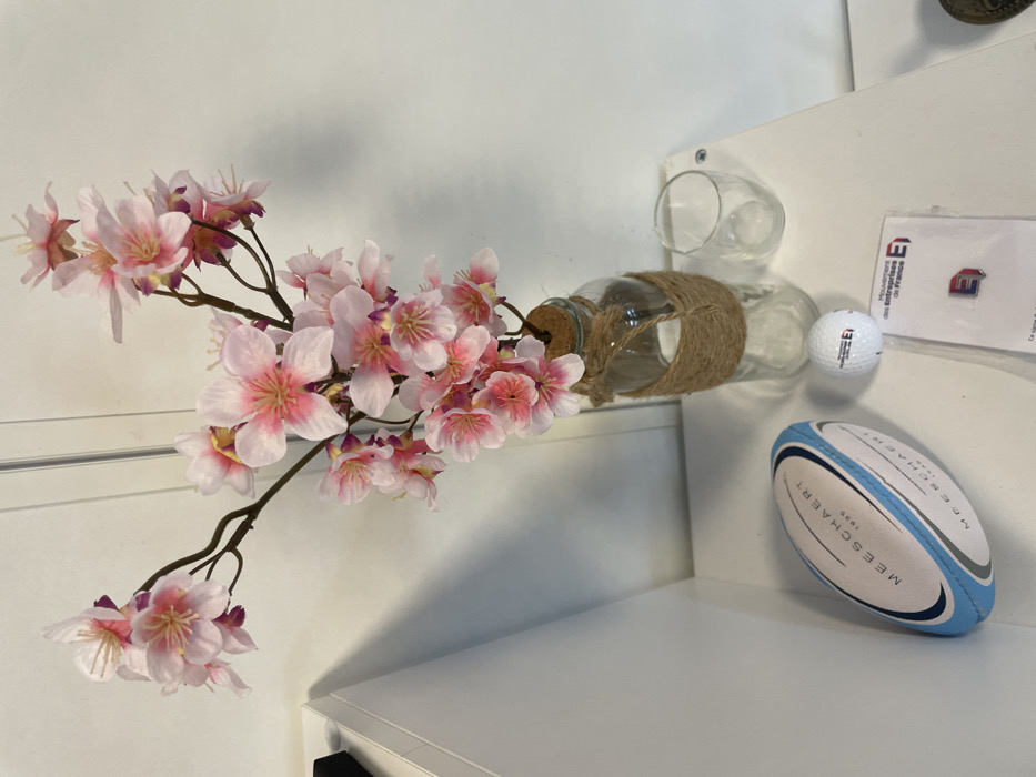 The image displays a static indoor arrangement on a white surface within Montigny-le-Bretonneux, France. A clear glass bottle vase, partially wrapped in natural twine and topped with a cork, stands centrally, holding several branches of artificial pink and white cherry blossoms. To the left, a small, light blue and white rugby ball is present, bearing the inscription "MEESCHAERT 1935". In front of the vase, a white golf ball is visible, marked with the logo of the 'Mouvement des Entreprises de France' (MEDEF), depicted as a red 'E' on a blue background within a red square. Adjacent to the golf ball, a metallic pin featuring the identical MEDEF logo is displayed on a white card encased in a transparent plastic sleeve. An empty, clear cylindrical glass is positioned to the right of the vase. The background consists of unadorned white walls.