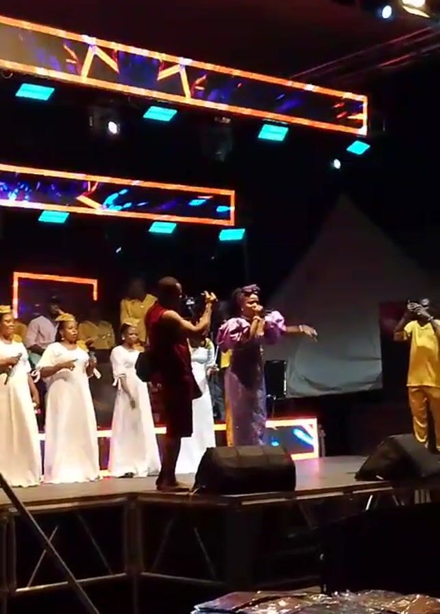 On a brightly lit stage, a woman in a lavender gown sings into a microphone, surrounded by a choir in white robes. A man in a red outfit films the performance with a phone or camera. Another man in a yellow suit plays an instrument off to the side. The stage is decorated with neon lights and geometric patterns. The atmosphere appears to be celebratory or festive.