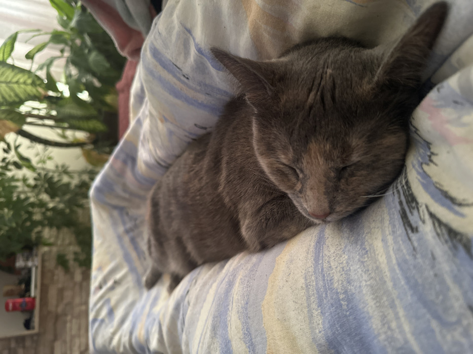 This image captures an indoor scene in the city of Tutrakan, Bulgaria. A domestic cat, identifiable as a dilute tortoiseshell with grey-blue and cream fur, is depicted sleeping on a bed or similar soft surface. The cat lies stretched out horizontally, eyes closed, with its head in the foreground facing left. It rests on a duvet cover featuring an abstract wavy pattern in shades of blue, cream, and light pinkish-brown. The background is out of focus, revealing a light-colored, possibly brick or stone, patterned wall on the left, beneath a shelf holding a red cylindrical object and other indistinct items. Multiple green potted plants are visible in the deeper background, indicative of a residential setting. No human subjects are present.