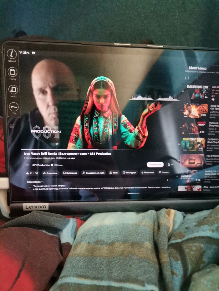 A dark gray Lenovo portable computing device, likely a tablet or laptop, is depicted displaying a YouTube video in Slanchevo, Bulgaria. The device rests on a soft, horizontally striped fabric surface with colors including blue, teal, beige, and brown. The screen shows a video titled "Ivan Vazov Drill Remix | Българският език x 681 Production" by the channel "681 Production," indicating 1108 views in one day. The active video frame features a light-skinned, bald man in the blurred background, partially obscured on the left. In the foreground, a young woman is prominently displayed, wearing a head covering and traditional or stylized Bulgarian attire with colorful embroidery in red, green, and white. She is gesturing with her right hand, palm open and slightly raised. A visual audio waveform is superimposed above her hand. The screen's upper left corner displays the time "11:28," Wi-Fi, and battery indicators. A vertical menu on the left side of the screen presents options labeled "Stand," "Hang," "Hold," and "Tilt." A right-side panel displays recommended videos under "Моят микс" (My Mix) and "БЪЛГАРСКИЯТ ЕЗИК" (The Bulgarian Language) sections. Faint reflections of the immediate environment are visible on the screen's surface. Below the video, engagement metrics and a partial comment section in Bulgarian are visible.